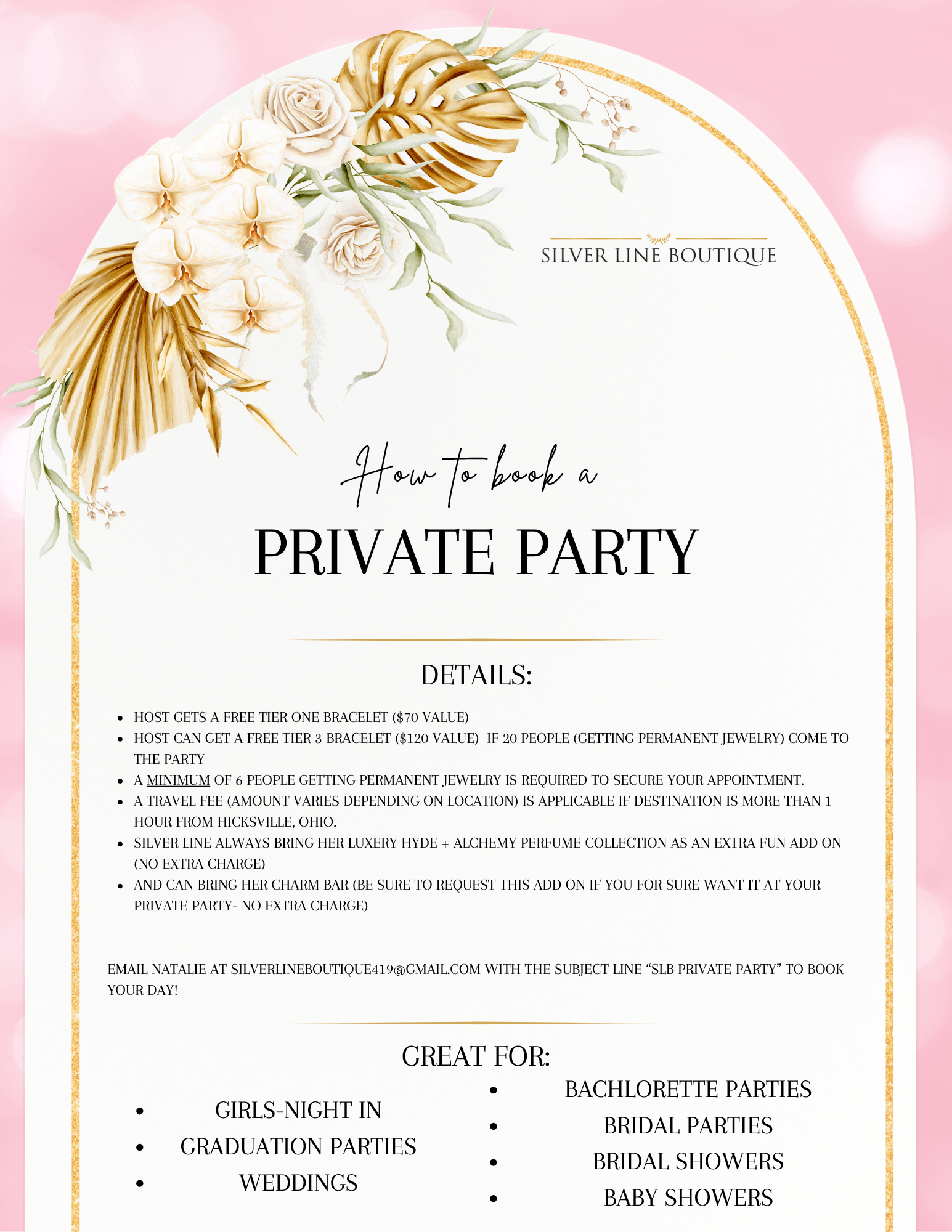 Host a private party for free! Must have 6+ women who are buying jewelry attending. (More are welcome!) As a thank you, SLB offers a free ($70 value) permanent bracelet to the host!