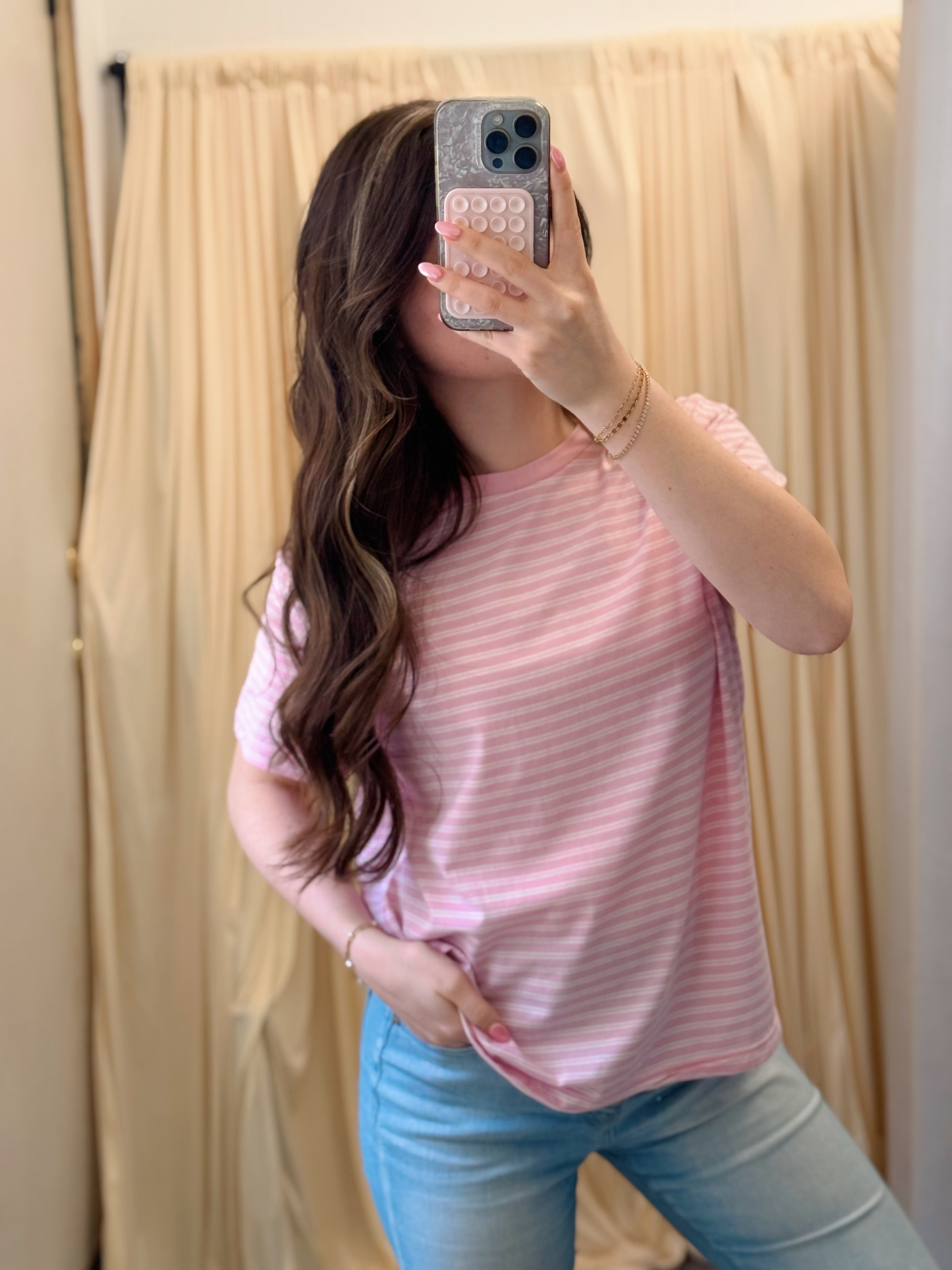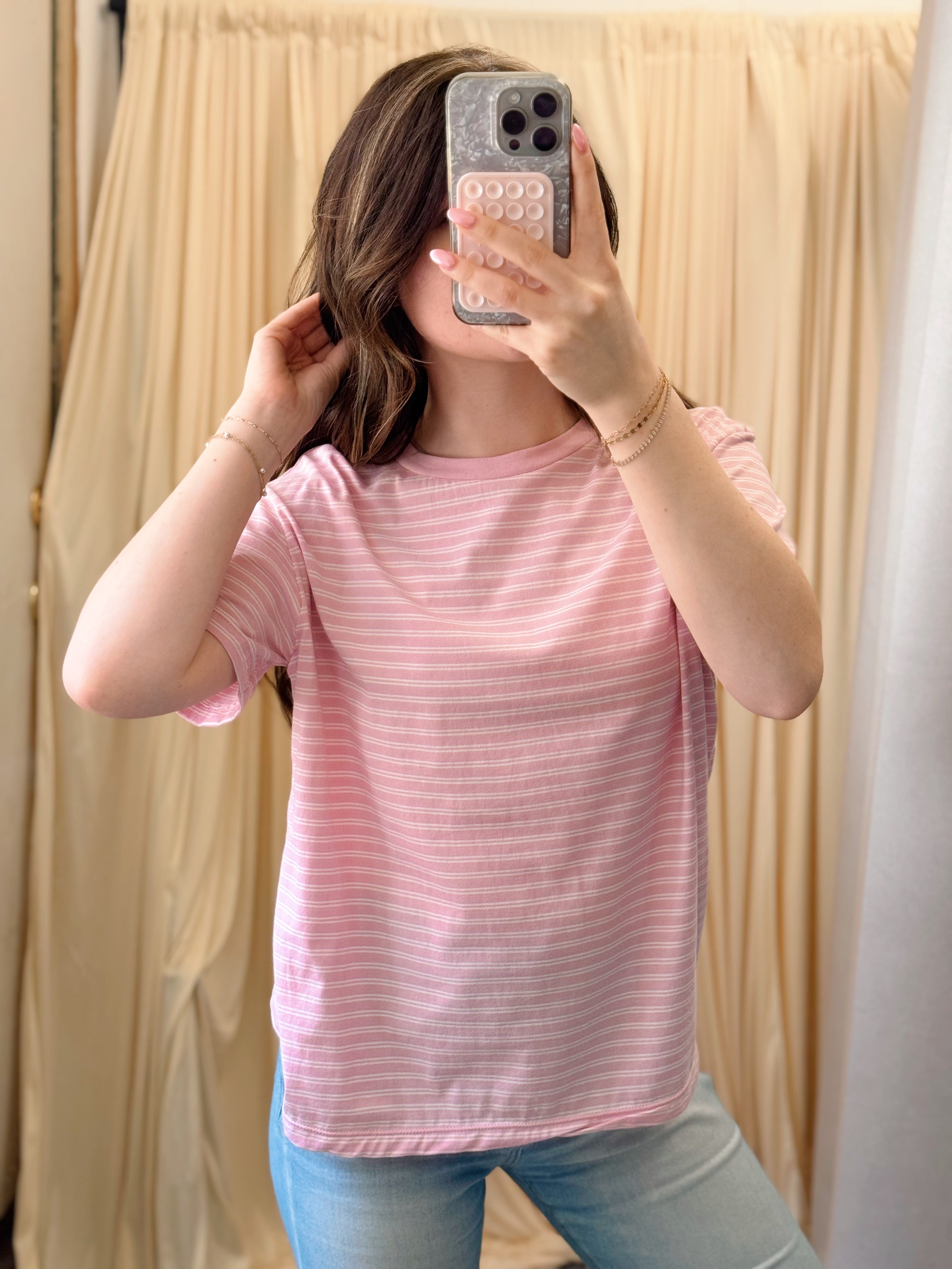 Soft, fresh, and easy to wear, the Blush & Bloom Stripe Tee brings a timeless feel to your everyday wardrobe. The pink and white stripes give it a light, feminine touch while keeping it classic enough for effortless styling.