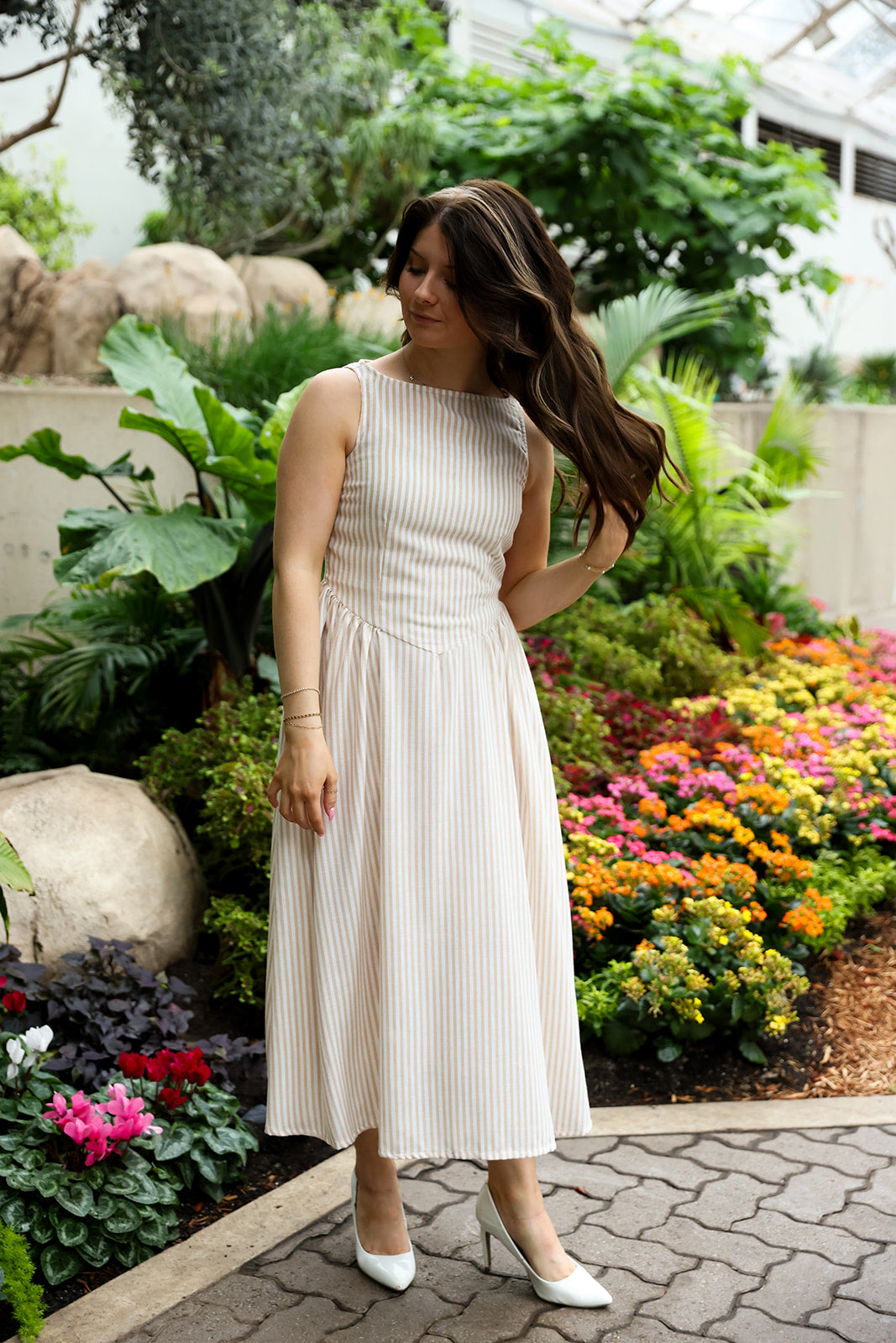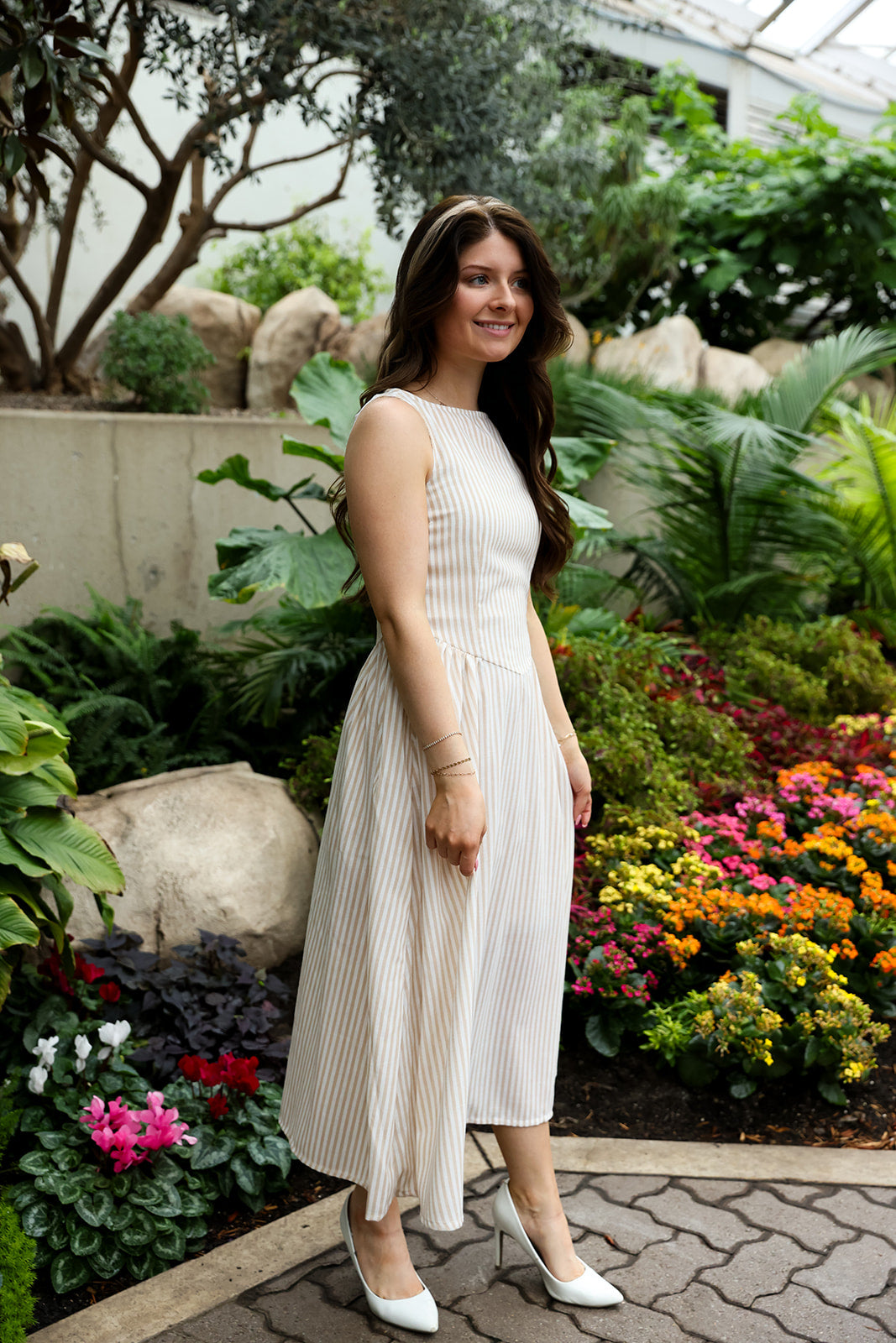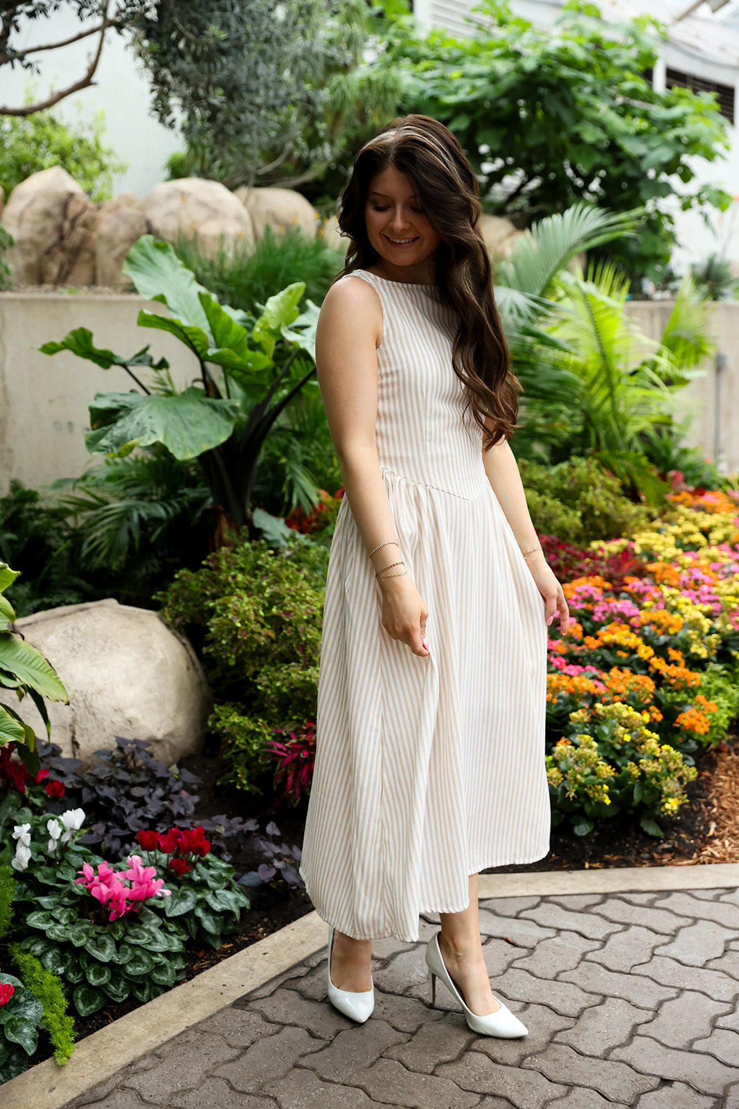 Easy, refined, and effortlessly timeless, the Desert Dust Sleeveless Dress brings soft neutral tones into a silhouette that feels both relaxed and elevated. The beige and white stripes add subtle texture, while the midi length keeps it polished and versatile.