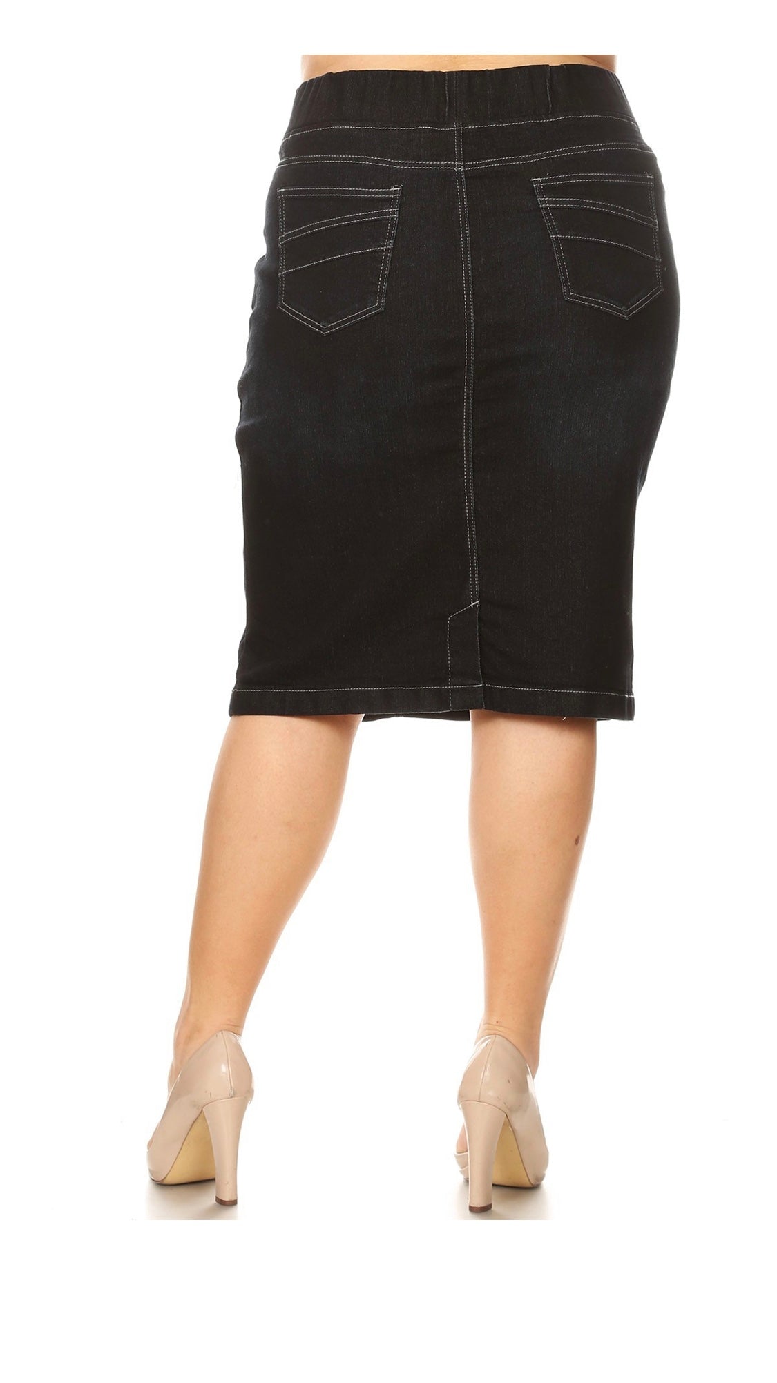 Maximize both style and comfort with our stretchy and comfy black denim skirt. Designed with extended plus sizes in mind, this skirt is perfect for all-day wear. Feel confident and fashionable in this must-have wardrobe staple.