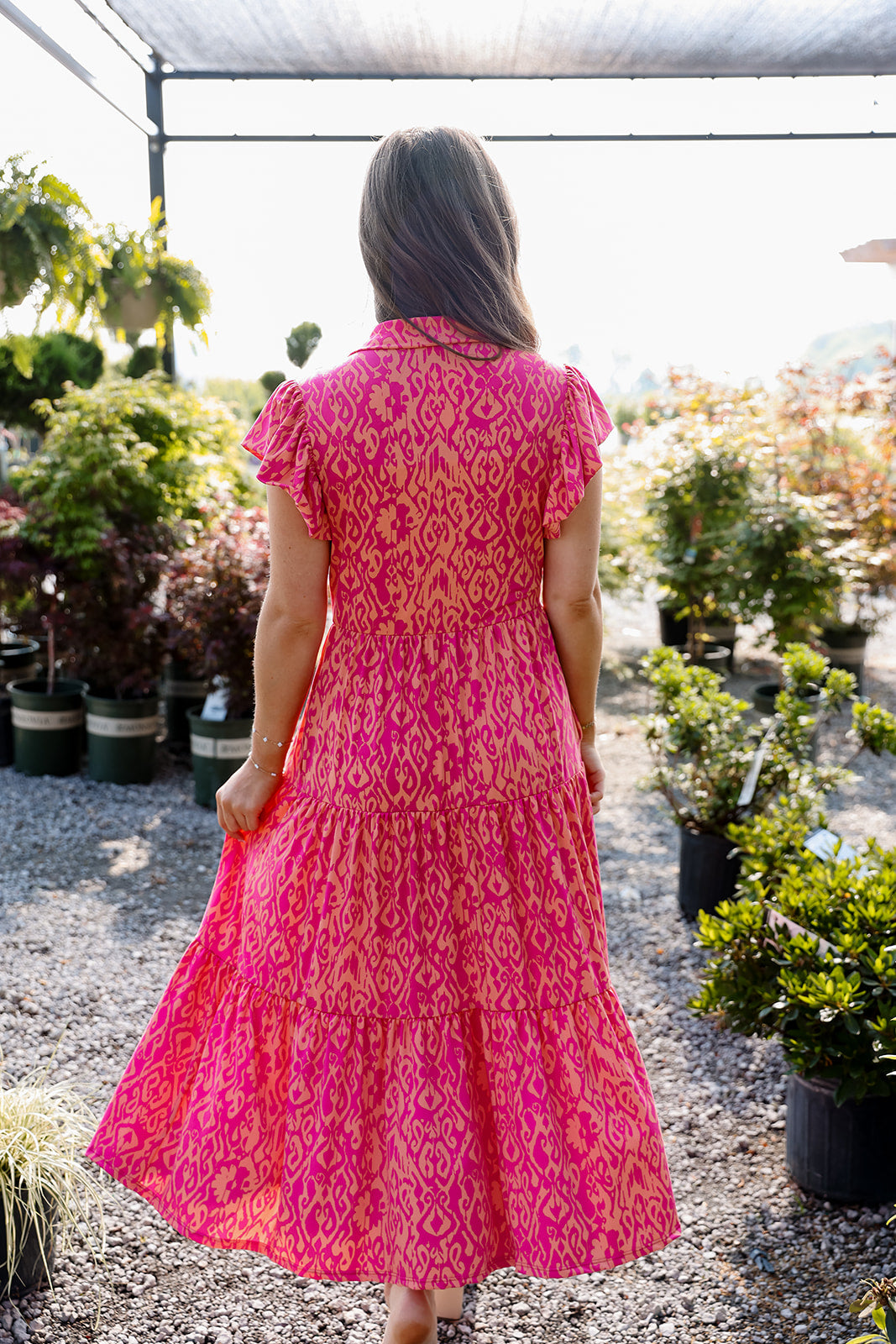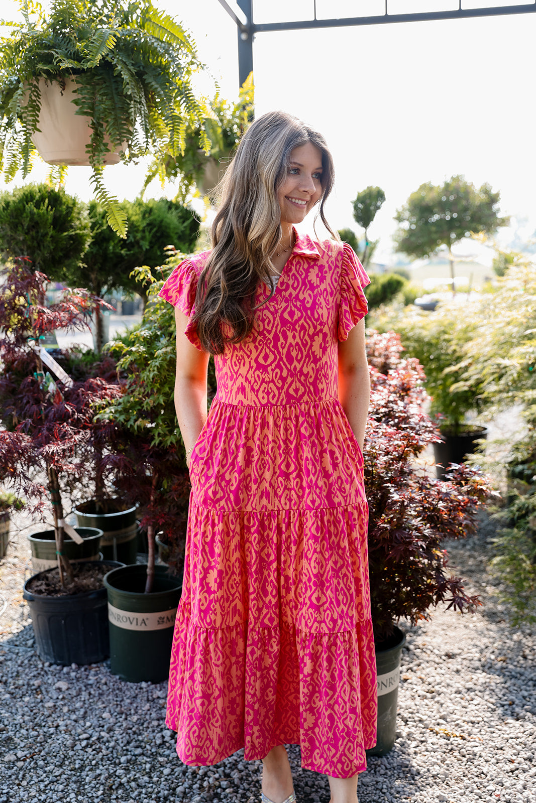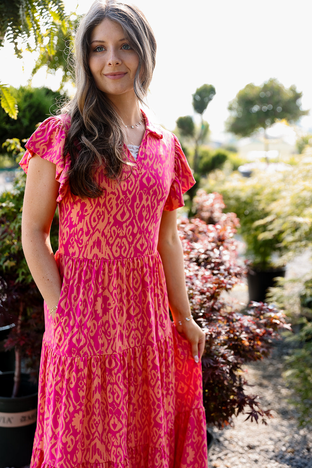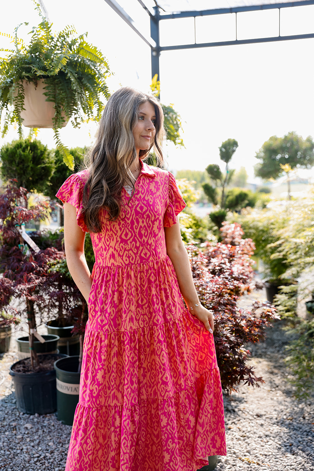 ✨ Features: Maxi length, pink and orange color blend, collared design.