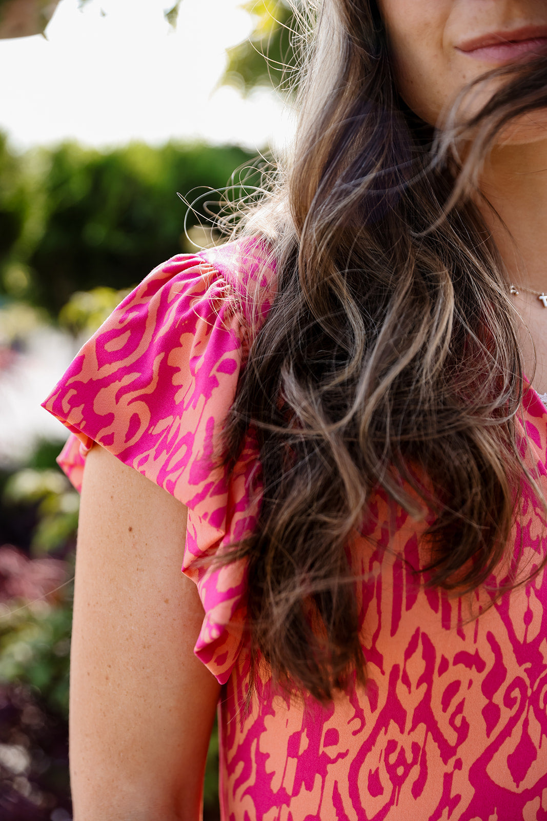 A vibrant blend of elegance and charm, this dress captures the beauty of golden-hour hues with its pink and orange tones. Perfect for making a statement while keeping your look timeless.