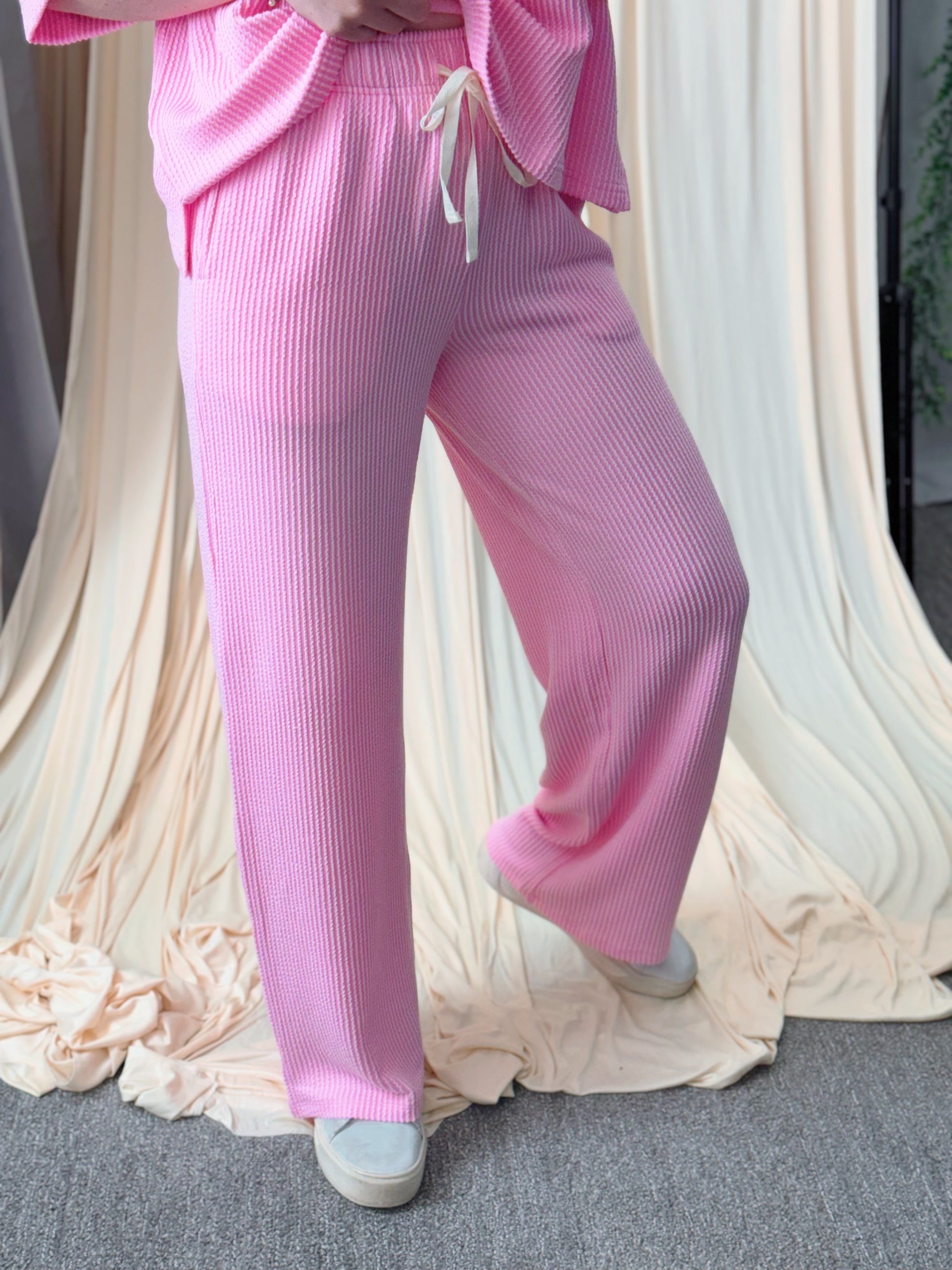 The Rosé Lounge Set brings an effortless blend of comfort and sophistication. Designed with a loose half-sleeve top and relaxed-fit bottoms, this matching set features ribbed detailing throughout for a touch of texture. The pants include a drawstring waist and pockets for ease, with an open-hem finish that drapes naturally for a laid-back, elegant look.