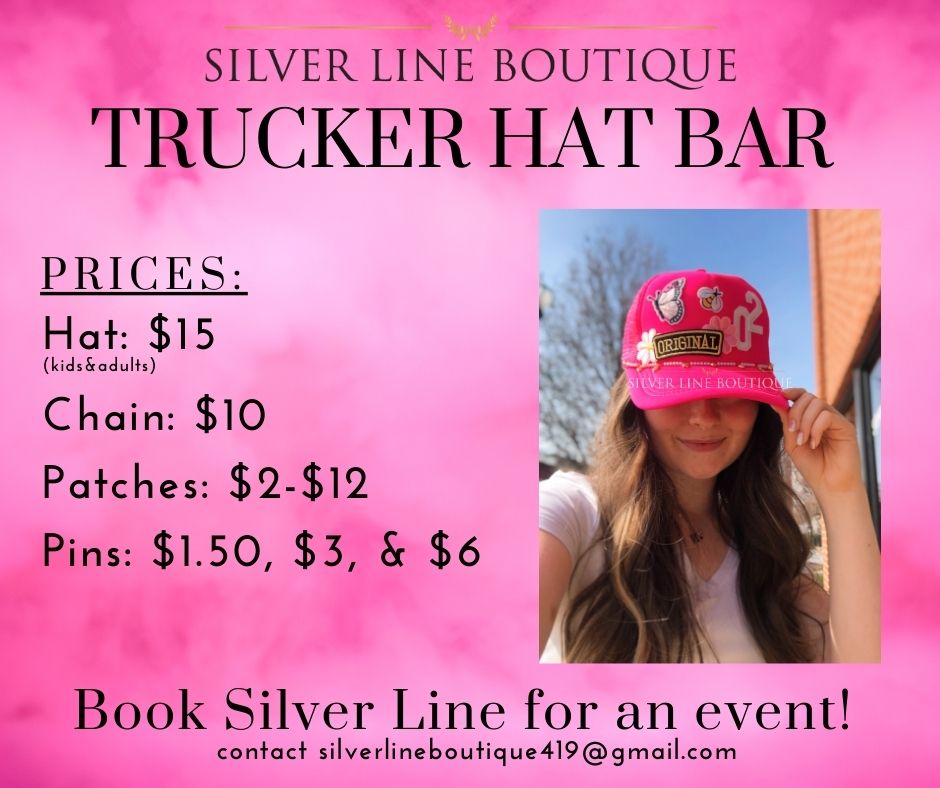 Welcome to Silver Line's Custom Trucker Hat Bar. Schedule an appointment for all your friends to come and make trucker hats together!