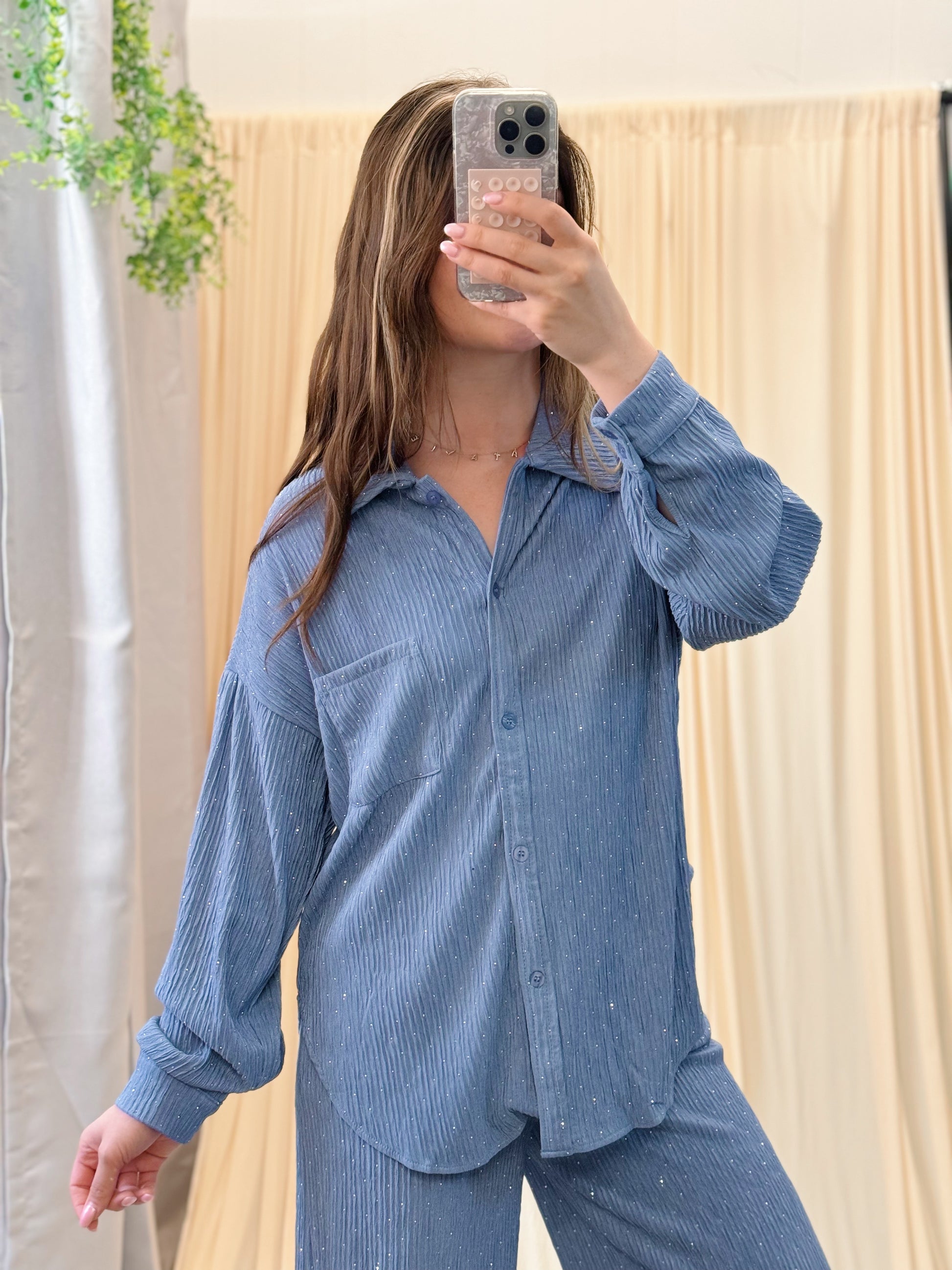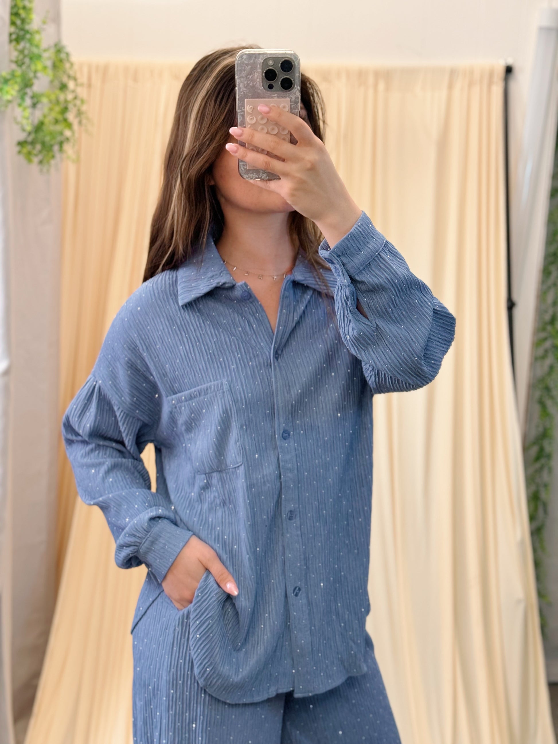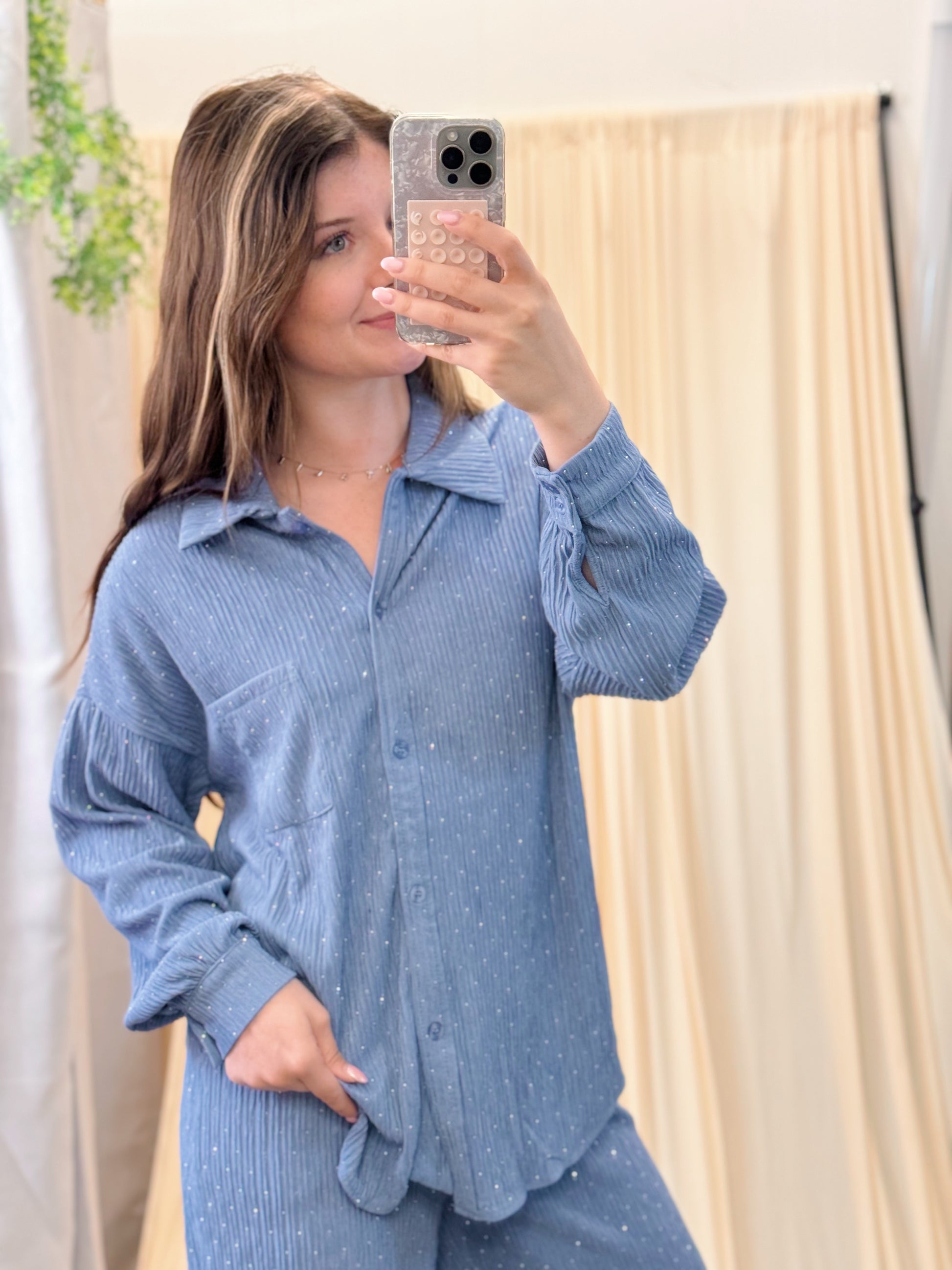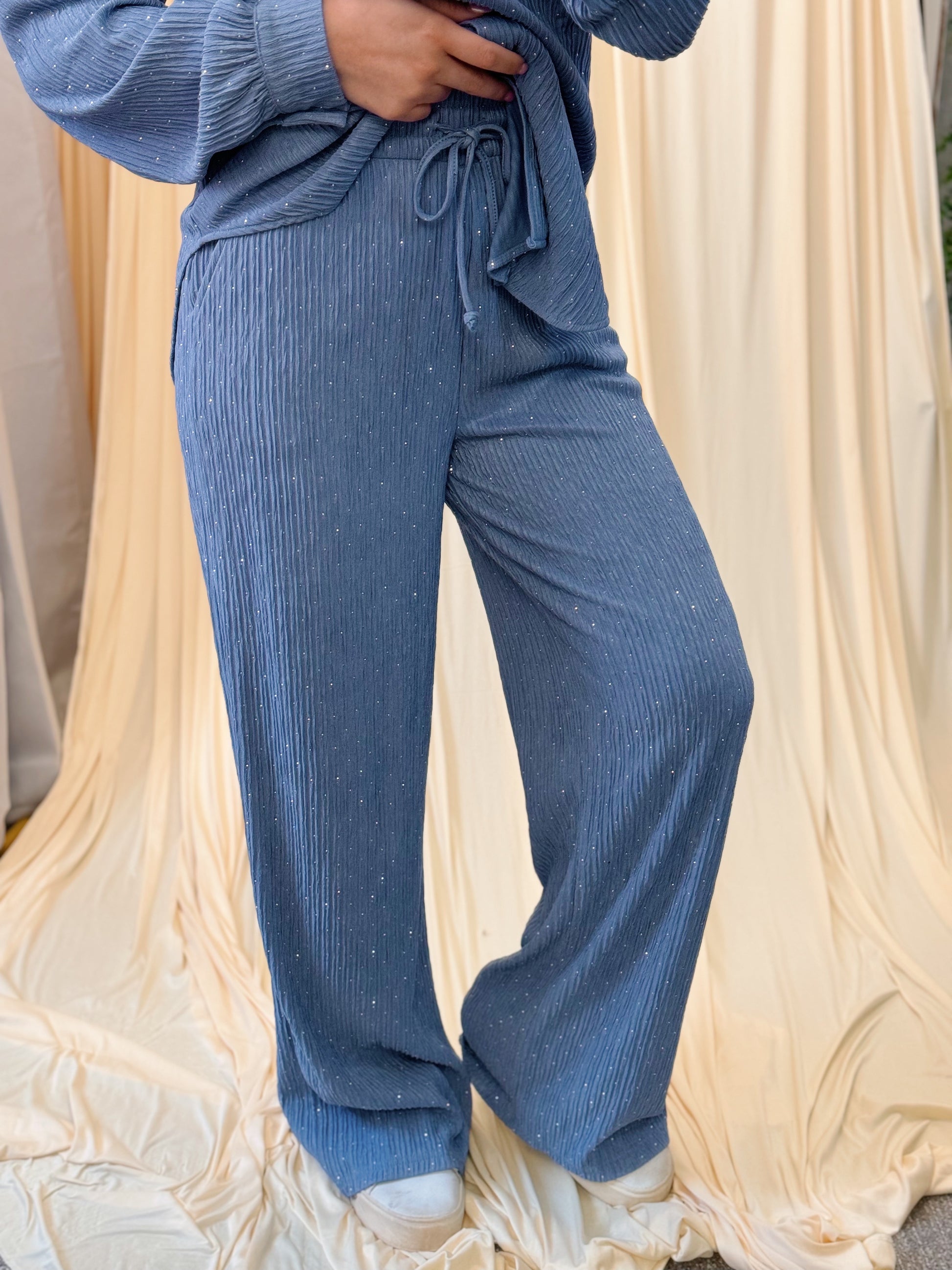 A lounge look that catches the light just right — the Starlit Ripple Set blends cozy texture with a touch of sparkle. Featuring a subtly wrinkled ribbed fabric that shimmers as you move, this matching set is as dreamy as it is wearable. The button-up top includes a classic collar and single chest pocket, while the drawstring sweats bring comfort and practicality with pockets on both sides.
