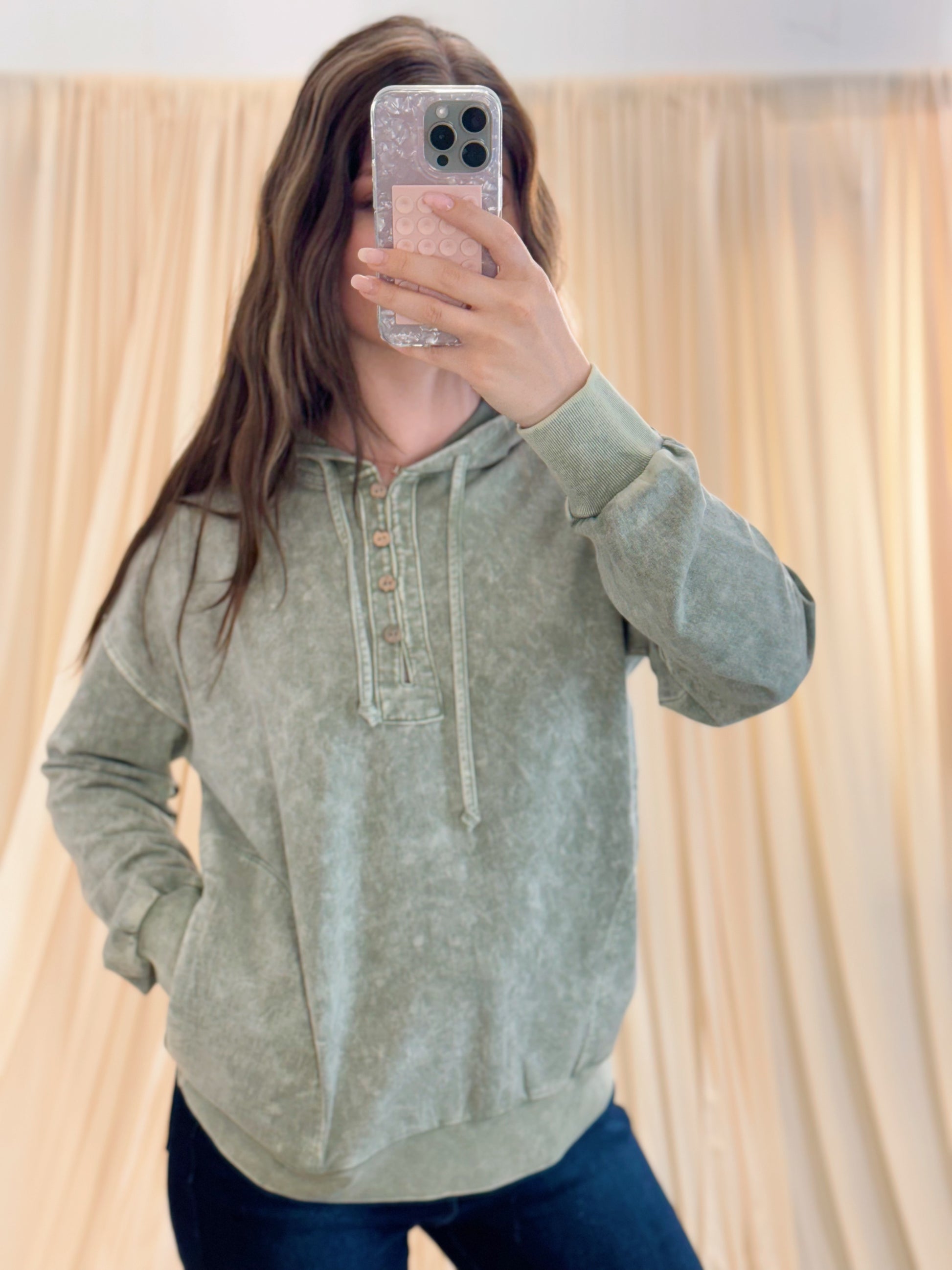 Laid-back comfort meets refined detail in the Willow Sage Hoodie. Designed in a soft sage hue, this versatile layer features a button-up front, adjustable hood with drawstrings, and practical pockets — the perfect balance of cozy and elevated.